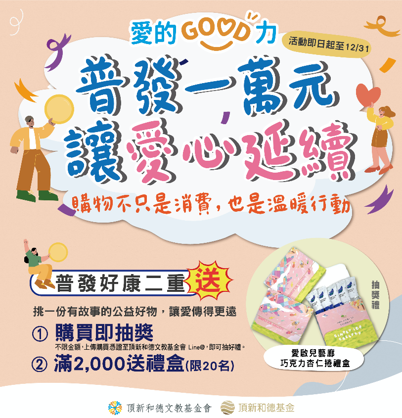 頂新和德文教基金會推出「愛的GOOD力」計畫,打造免費公益行銷平台,協助公益團體推廣商品,無論是捐款或是購買義賣商品,邀請您透過不同的行動來幫助公益團體,給予最大的支持!