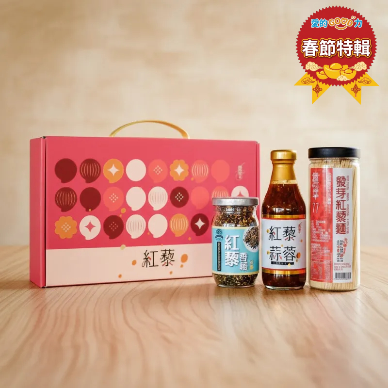 紅藜素香鬆90克+紅藜蒜蓉醬油膏250ML+發芽紅藜麵300克。